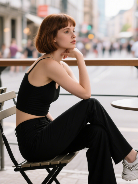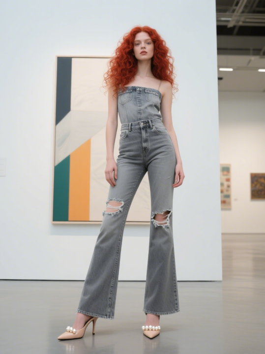 裤腰高度需覆盖肚脐以上 2-3cm,搭配短款上衣时,裸露的腰部肌肤形成「视觉分割线」,强制划分上下身 1:2 比例。