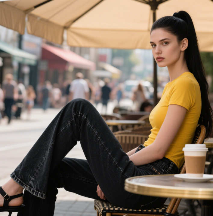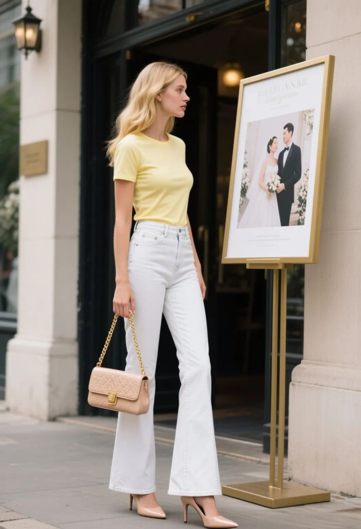 黄色修身短 T +黑色马蹄裤,短 T 紧贴上身,露出腰部线条,黑色裤装选做旧水洗款降低亮黄光感,搭配黑色凉鞋,高饱和黄黑撞色形成强烈视觉冲击。