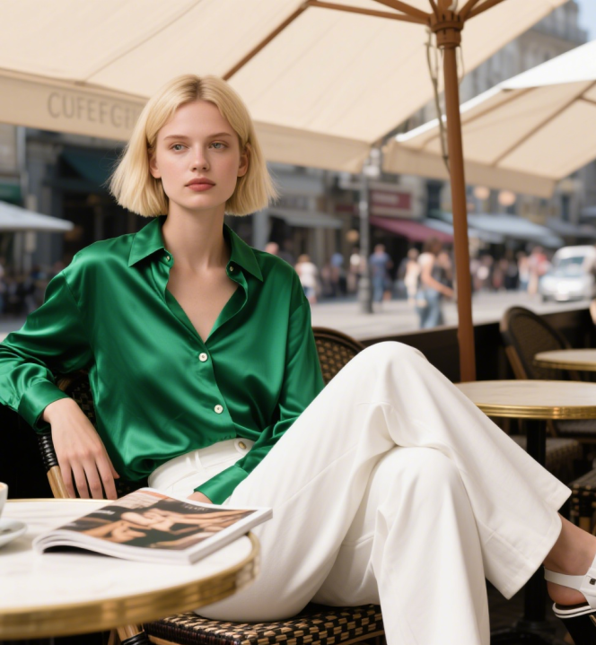 绿色缎面oversize 衬衫 +白色马蹄裤,衬衫解开下摆 3 颗扣子,白色裤子弱化绿色的攻击性,缎面材质反光与裤子哑光形成质感对比,搭配白色凉鞋,休闲中带设计感。