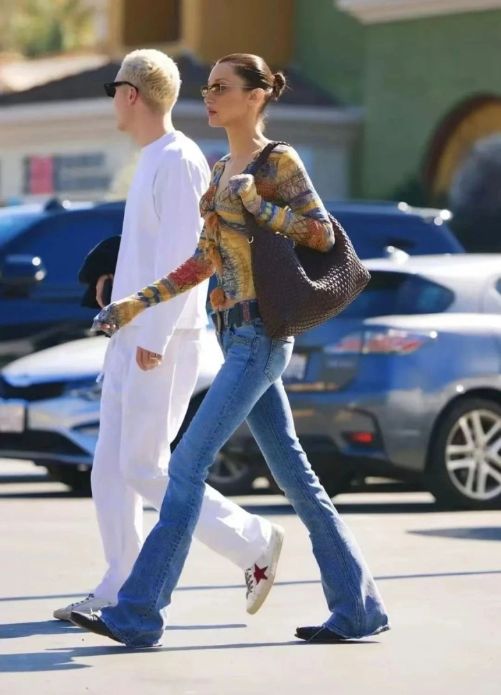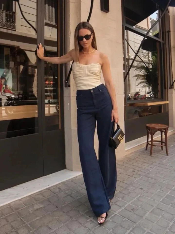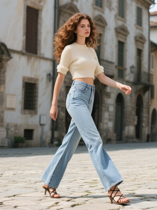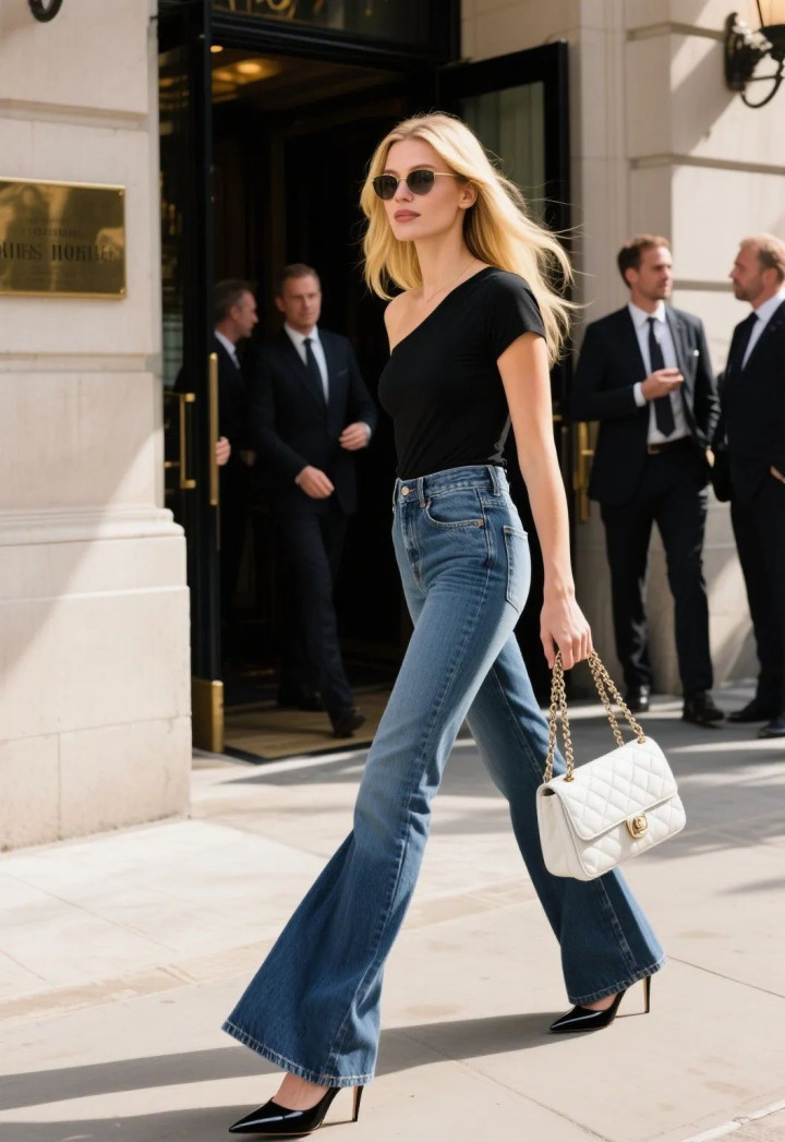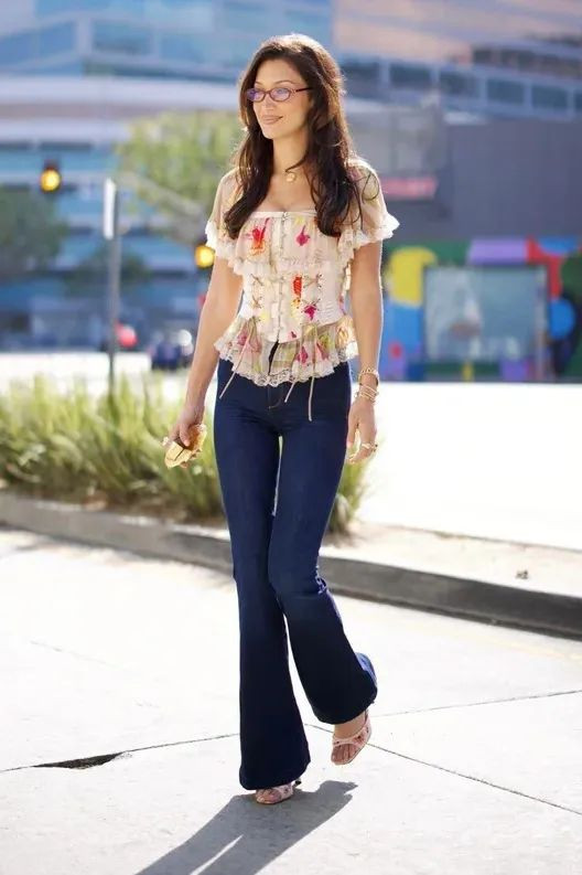 用露脐款或高腰短 T 强调腰线,让马蹄裤的上紧下扩轮廓更显利落,适合搭配高跟鞋打造美式街头感。