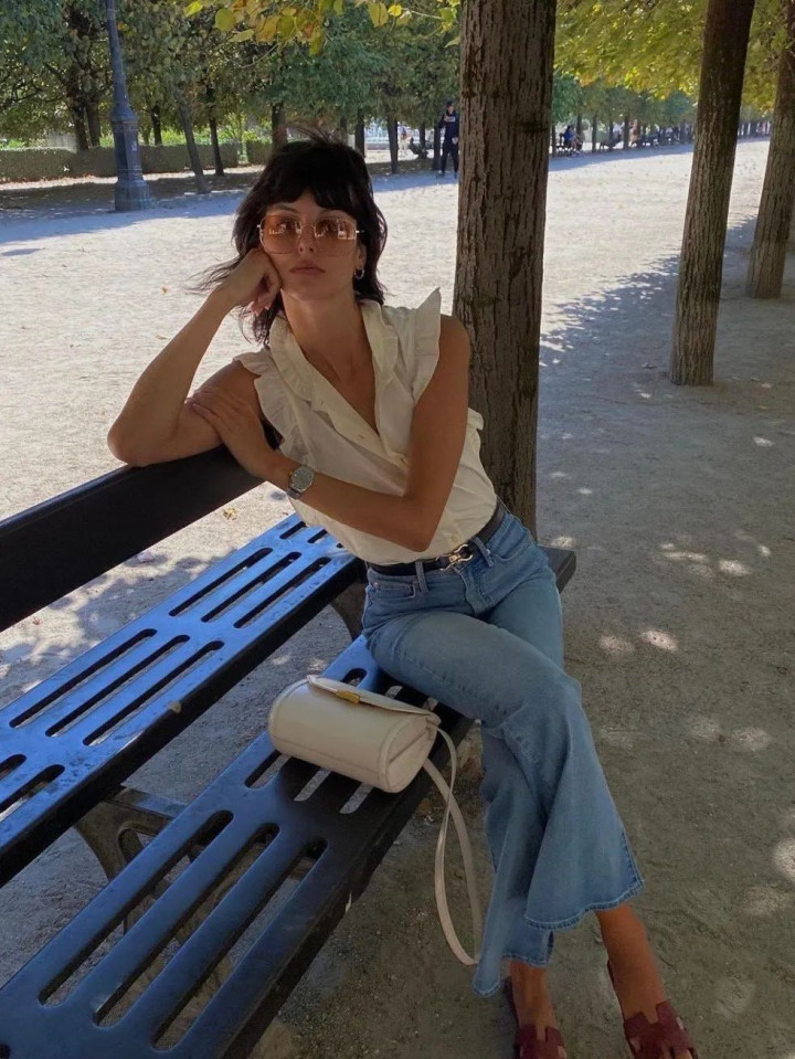 燕麦色条纹 T 恤 + 米白牛仔马蹄裤,条纹 T 恤竖纹显瘦,下摆塞 1/2 到裤腰,露出燕麦色与米白的过渡色,搭配草编包和米色穆勒鞋,打造法式慵懒风。