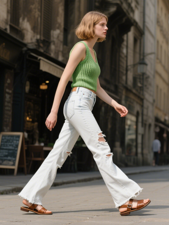 草绿短款针织背心 + 白色牛仔马蹄裤,背心露出手臂和腰线,牛仔选磨白做旧款,降低饱和度,复古中带清新感。