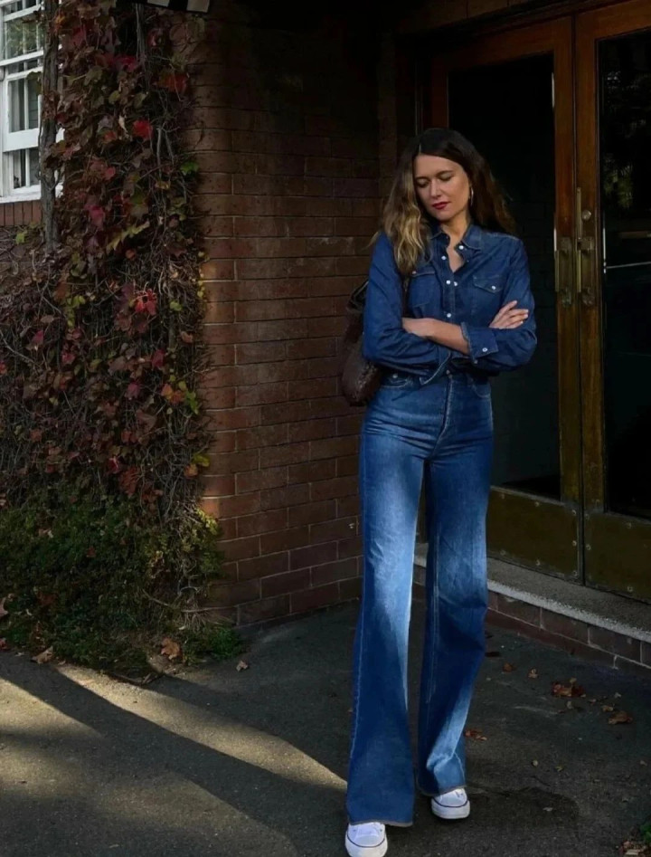 也可以用蓝色牛仔衬衫搭配牛仔马蹄裤,休闲中带复古松弛感。