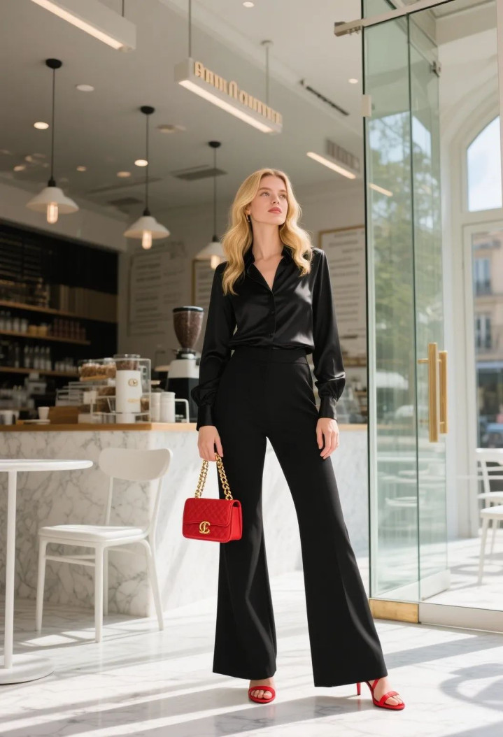 深色马蹄裤可搭配同色高跟鞋,如黑色裤 + 黑色鞋,纵向线条更统一。