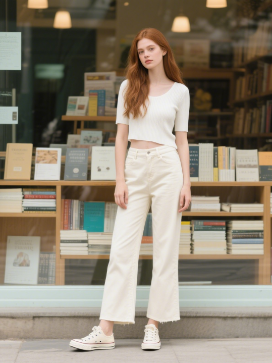 奶白色短款针织衫 + 米白马蹄裤,同色系不同明度叠穿,针织衫选冰丝材质,垂坠感弱化腹部线条,露出脚踝,搭配米白帆布鞋,整体像融化的香草冰淇淋,适合通勤或下午茶。